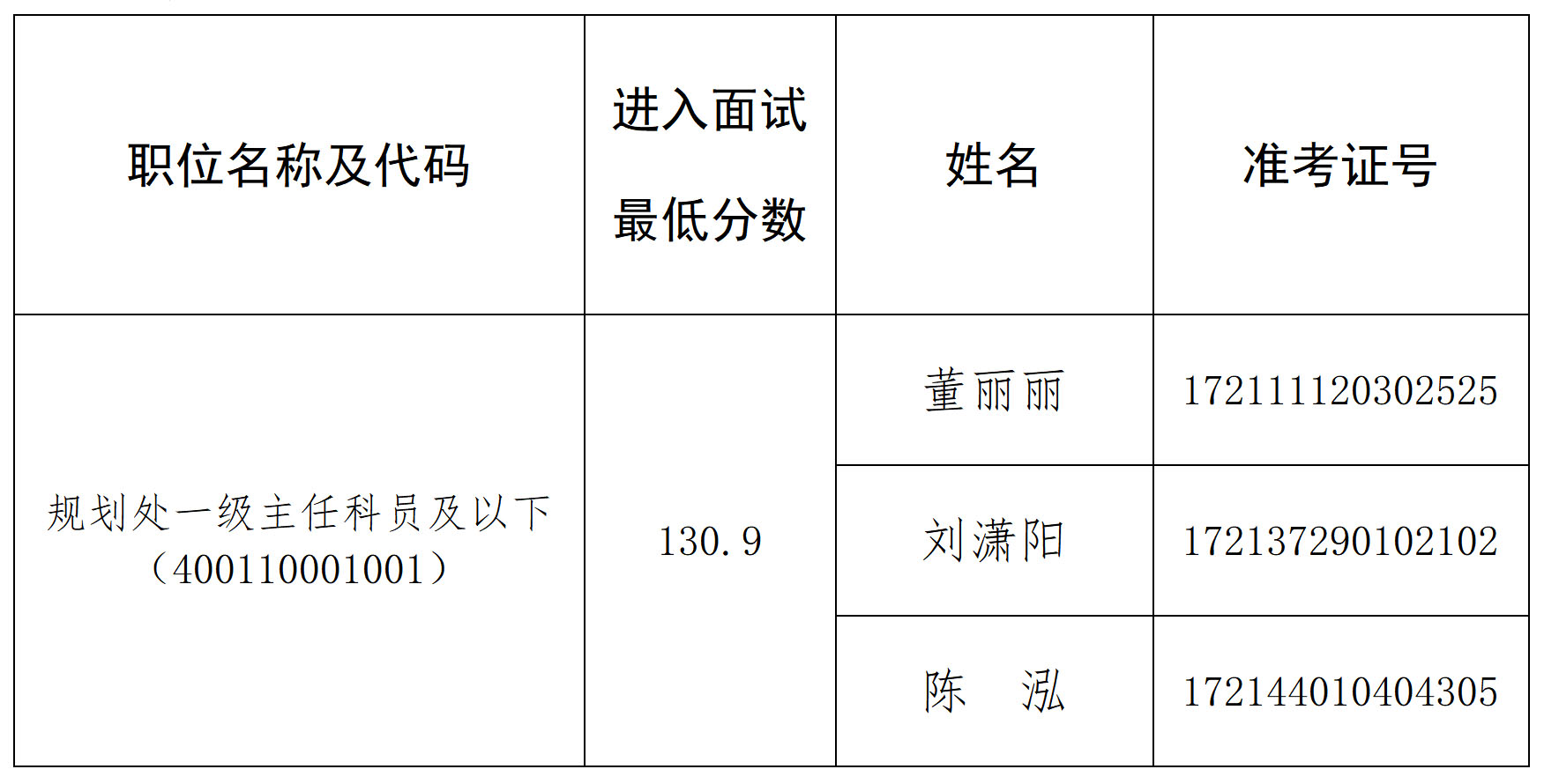 因部分考生放弃面试资格,根据公务员招考有关规定,按照笔试成绩从高到低的顺序,递补以下考生为面试人选(按准考证号排序):