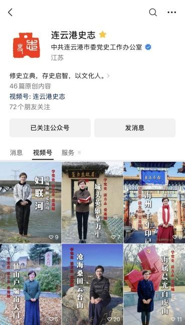 2025年3月,由中共连云港市委党史工作办公室(连云港市地方志编纂委员会办公室)主管的“连云港史志”视频号开通上线,现已推送史志系列短视频6期。